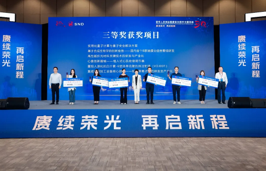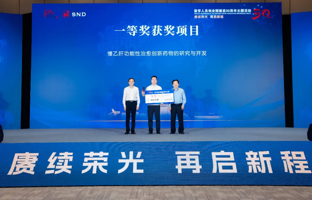 全國(guó)政協常委、港澳台僑委員(yuán)會(huì)副主任、 緻公黨中央副主席兼秘書(shū)長(cháng)盧國(guó)懿(圖右),蘇州市(shì)委常委、市(shΩì)委統戰部部長(cháng)、市(shì)委秘書(shū)長(cháng)王飏(圖左)為(wèi)獲得(de)一(yī)等獎的→(de)西(xī)安新通(tōng)藥物(wù)研究團隊頒獎