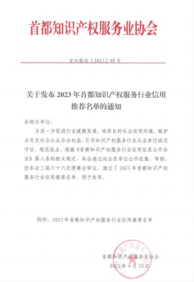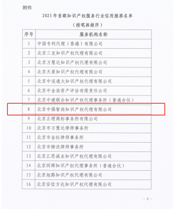 - <喜報(bào)>中強智尚入圍《2023年(nián)首都(dōu)知(zhī)識産權服務行(xí₩ng)業信用(yòng)推薦名單》