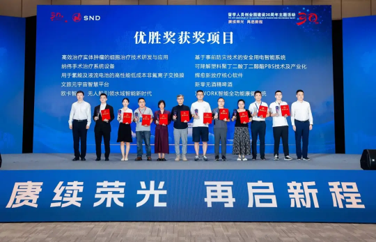 全國(guó)政協常委、港澳台僑委員(yuán)會(huì)副主任、 緻公黨中央副主席兼秘書(shū)長(cháng)盧國(guó)懿(圖右),蘇州市(shì)委常委、市(shΩì)委統戰部部長(cháng)、市(shì)委秘書(shū)長(cháng)王飏(圖左)為(wèi)獲得(de)一(yī)等獎的→(de)西(xī)安新通(tōng)藥物(wù)研究團隊頒獎