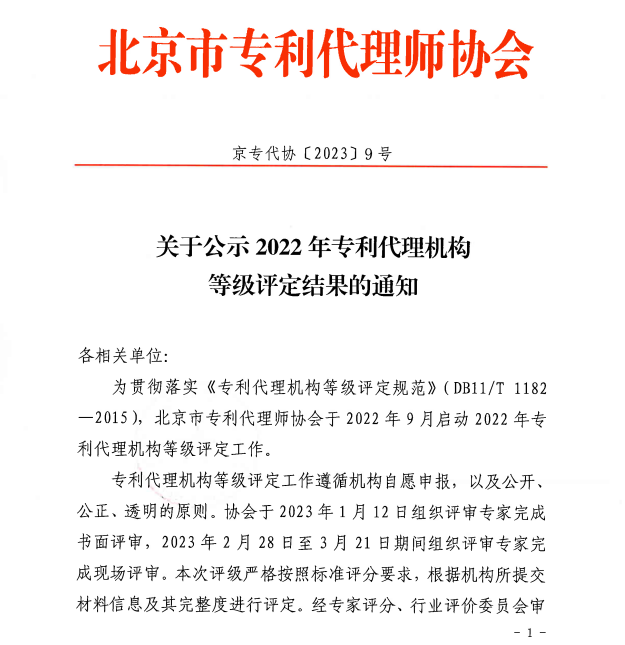 • 為(wèi)貫徹落實《專利代理(lǐ)機(jī)構等級評定規範》(DB11/T11822015),北(b÷ěi)京市(shì)專利代理(lǐ)師(shī)協會(huì)于2022年(nián)9月(yuè)啓動2022年(nián)專利代理(lǐ)機(jī)構等級δ評定工(gōng)作(zuò),并于2023年(nián)1月(yuè)12日(rì)組織評審專家(jiā)完成書(shū)面評審。2023年(nián)2月(yuè)₩28日(rì)至3月(yuè)21日(rì)期間(jiān)組織評審專家(jiā)完成現(xiàn)場(chǎng)評審,于2023年÷(nián)4月(yuè)3日(rì)發布結果公告。 經過北(běi)京市(shì)專利代理(lǐ)師(shī)協會(huγì)的(de)數(shù)日(rì)評審,本次評定最終确定4... [2023-04-04]